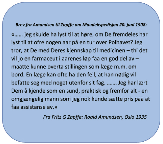 Dessuten bidro journalisten Zapffe til å skape blest rundt ekspedisjonene slik at pengeinnsamlinger gikk lettere. Hver gang Amundsen besøkte Tromsø etter Gjøa-ekspedisjonen overnattet han privat hos apotekfamilien. Zapffes elskverdighet og løsningsorientering ga Amundsen, som ofte ble kritisert av andre, en rekke fordeler. Som vi ser av brevveksling (ramme) hadde Amundsen stor tillit til farmasøytvennen. På Spitsbergenekspedisjonen mot Nordpolen i 1925 med flybåtene N24 og N25 fikk Amundsen endelig overtalt Zapffe til å delta som materialforvalter og sanitetsmann for bakkestyrken på Kings Bay (Ny Ålesund). For polferden som Amundsen og Umberto Nobile (1895–1978) gjennomførte med luftskipet Norge i 1926 ble også Zapffe hyret inn som materialforvalter og driftssjef for startstedet Kings Bay.